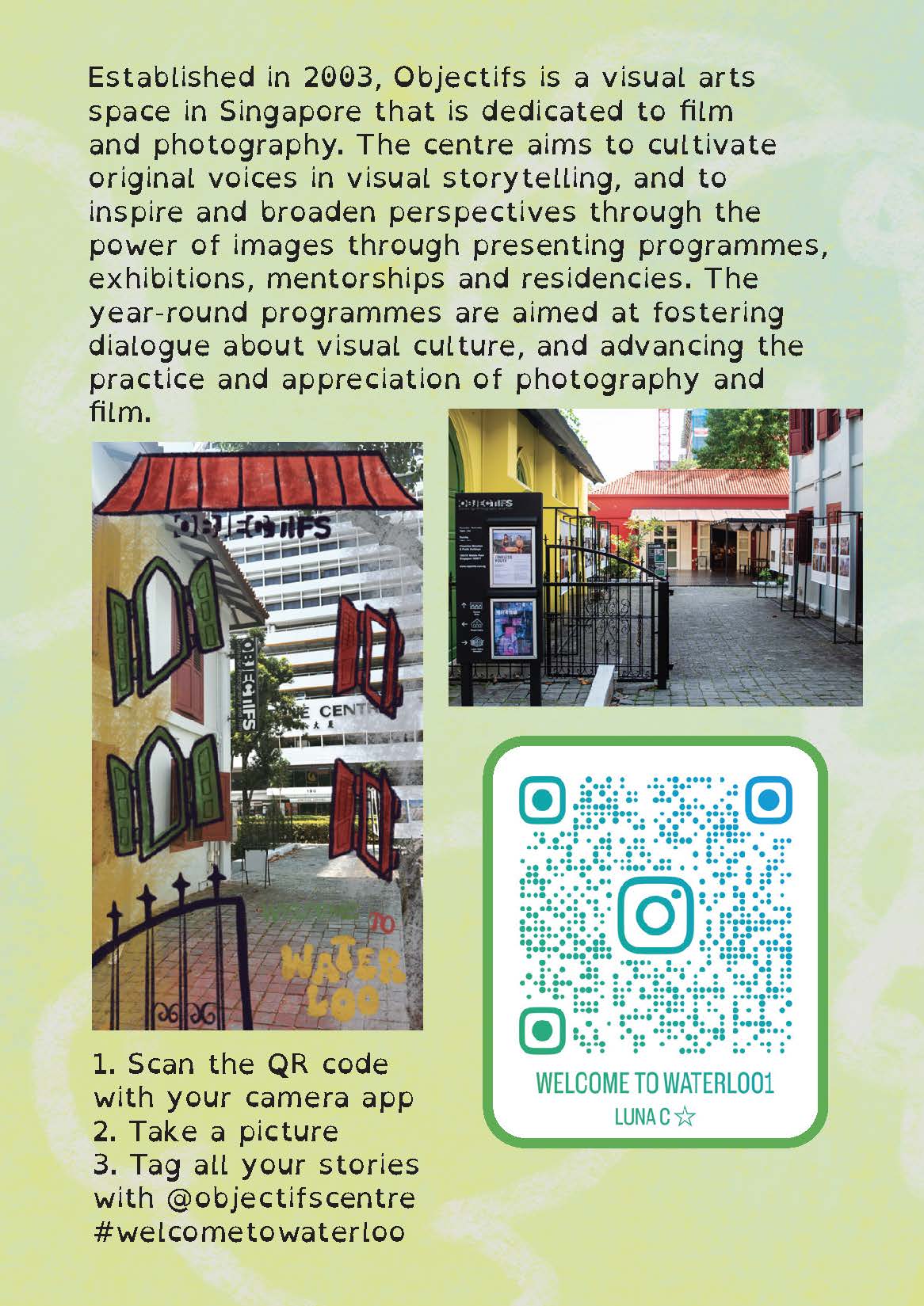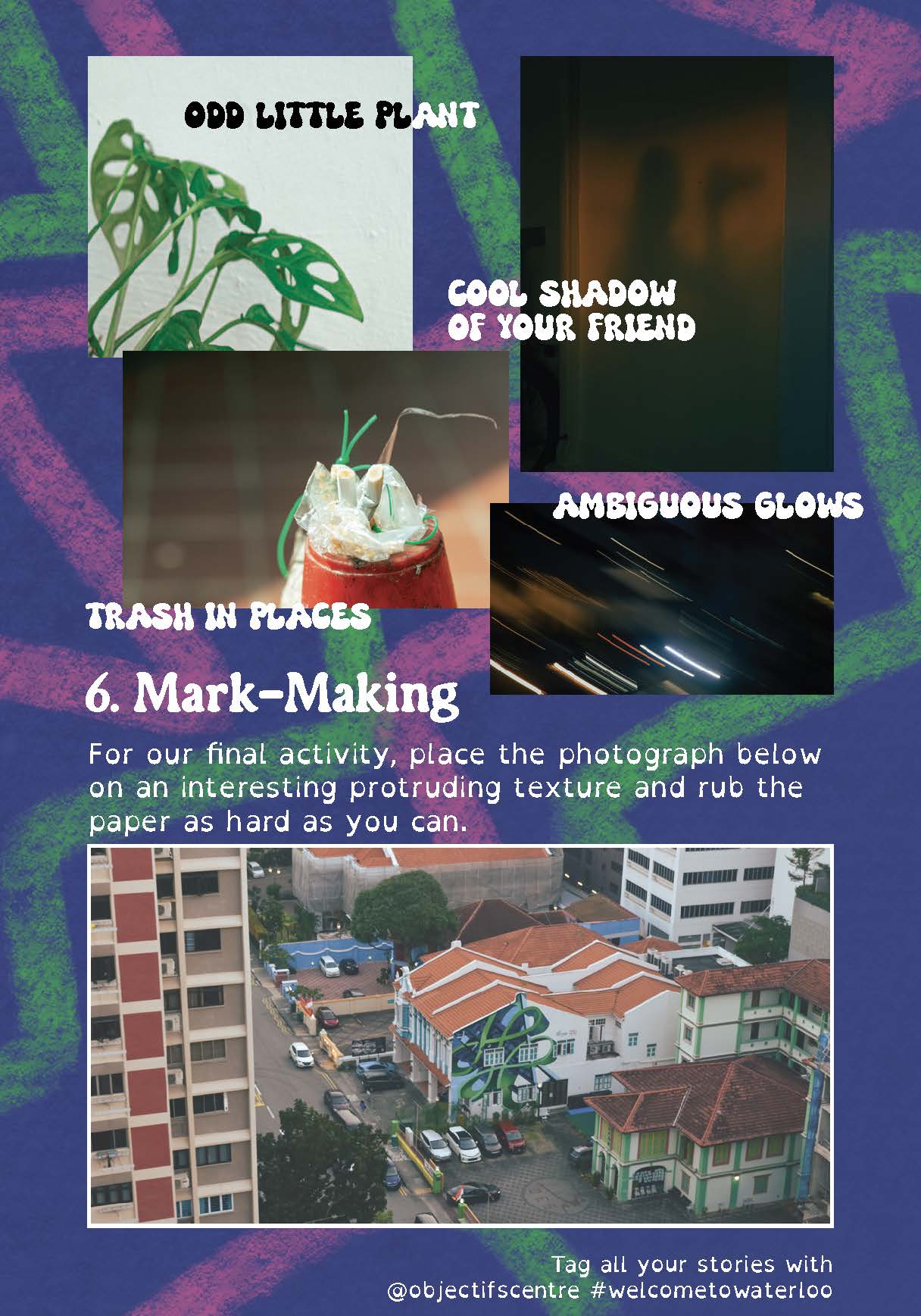 Welcome to Waterloo is an interactive zine filled with photo-taking activities to be carried out on the premises of Waterloo. The zine acts as a little guidebook to taking pictures around the Waterloo estate- promoting conscious and intentional photo-taking and experimental ways of seeing habits when it comes to taking photographs with our mobile devices.